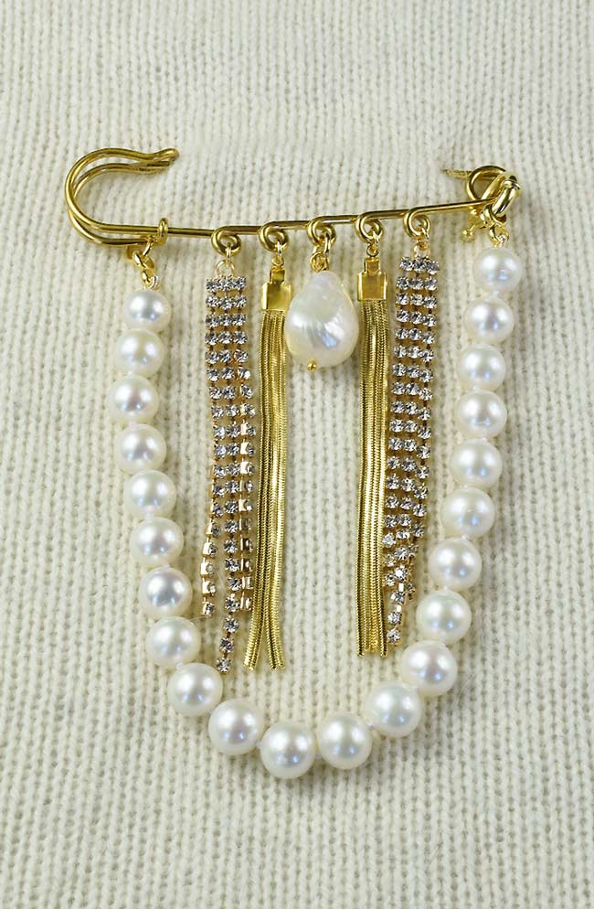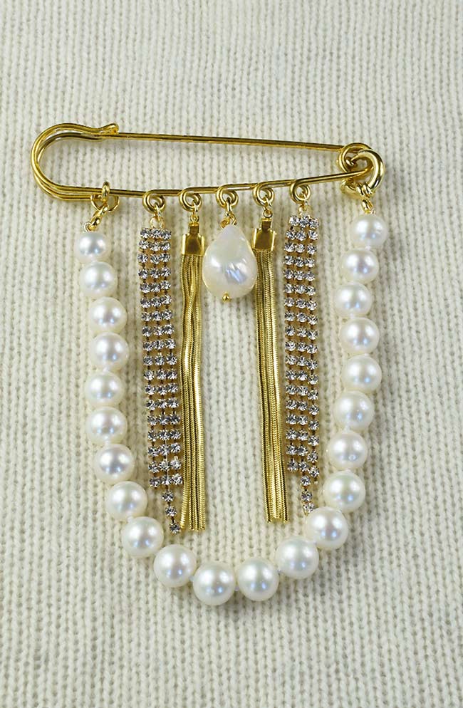 Deze stainless steel broche bestaat uit een ris ronde parels, gecombineerd met elegante gouden kwastjes en fijne kettinkjes met sprankelende zirkonia’s. Als finishing touch in het midden een grote barokparel, die de broche een luxe en unieke uitstraling geeft.