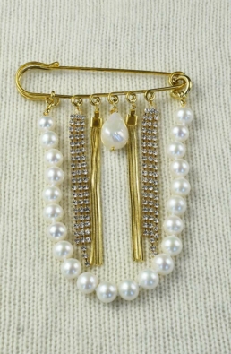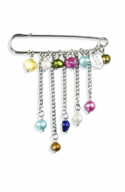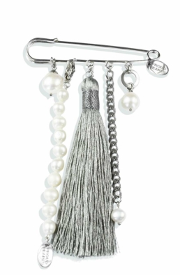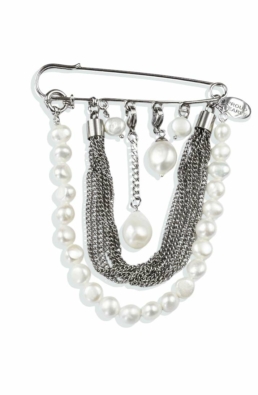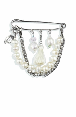 Deze stainless steel broche bestaat uit een ris zoetwaterparels, gecombineerd met een elegante zilveren kwastje en fijne kettinkjes met sprankelende zirkonia’s. Als finishing touch een grote barokparel, die de broche een luxe en unieke uitstraling geeft.